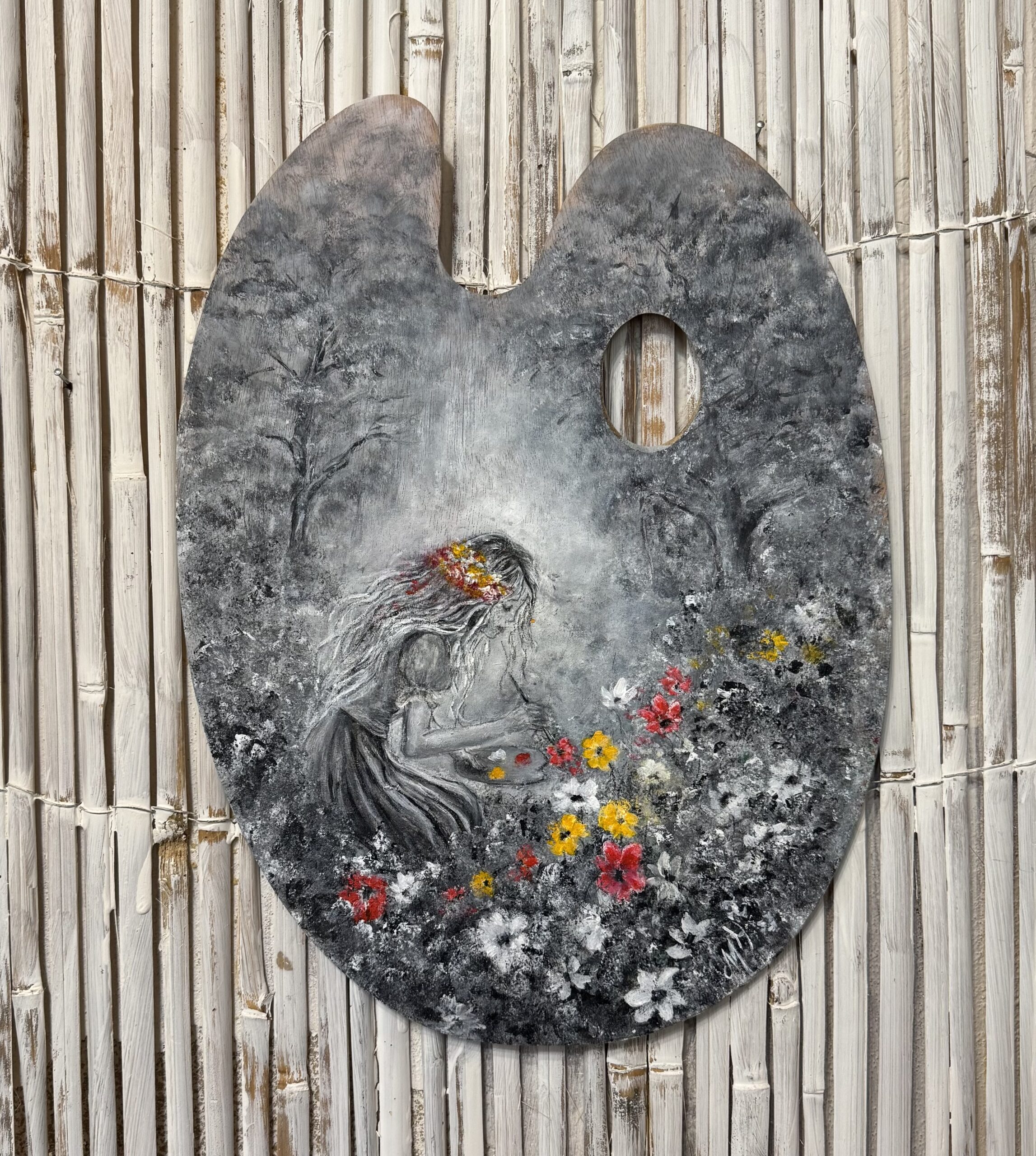 Autorský obrázek namalovaný na dřevěné paletě.